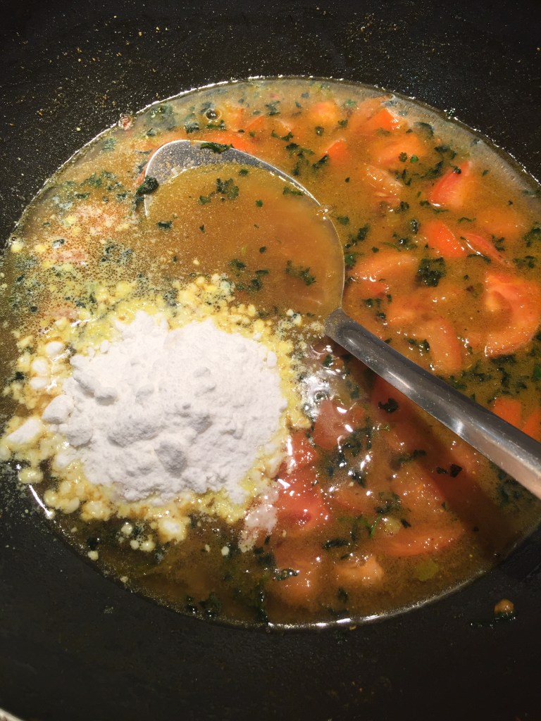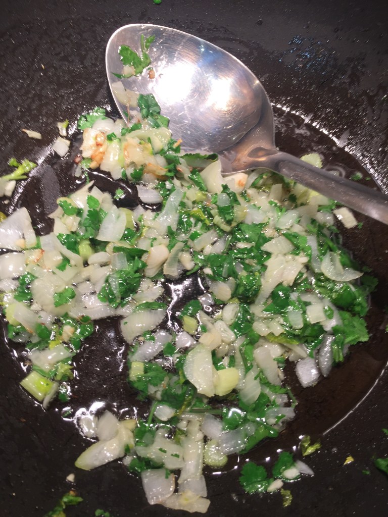 Siekamy cebulę, czosnek i kolędrę. Wrzucamy na olej, podsmażamy na niewielkim ogniu. Wrzucamy proszek curry i kurkumę. Chwilę smażymy. Na to wrzucamy posiekanego pomidora. Smażymy aż pomidor trochę zmięknie.