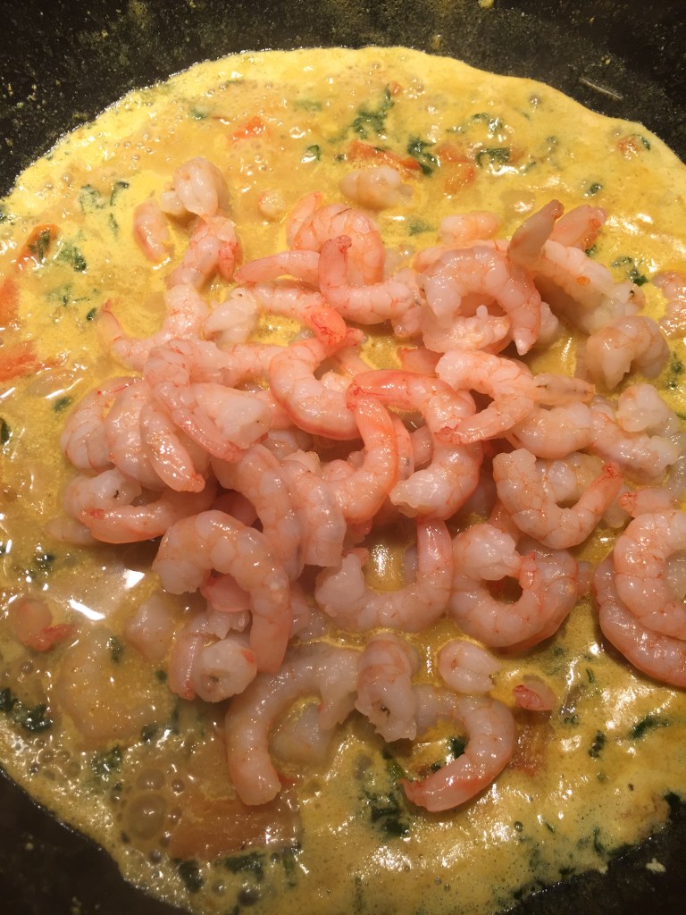 Curry z krewetek jest dla mnie daniem przypominającym spacery po pięknej plaży Pigeon Point na Tobago, nasycone mlekiem kokosowym i smakiem delikatnych krewetek. Mimo że dla mnie jest to jedno z najszybszych dań z curry, na Trynidadzie wymaga ono długiego przygotowania, gdyż krewetki sprzedawane są w skorupkach! Moja teściowa potrafi siedzieć przez godzinę dokładnie obierając każdą nawet najmniejszą krewetkę ze skorupki. W Polsce i w Angli na szczeście są one już gotowe, nawet już ugotowane… Ja używam mrożonych krewetek, najcześciej tych różowych, które wcześniej były ugotowane, gdyż żadko można spotkać surowe lub świeże. Do tej potrawy najlepsze są małe krewetki tzw. shrimps raczej niż te większe ‚prawns’.