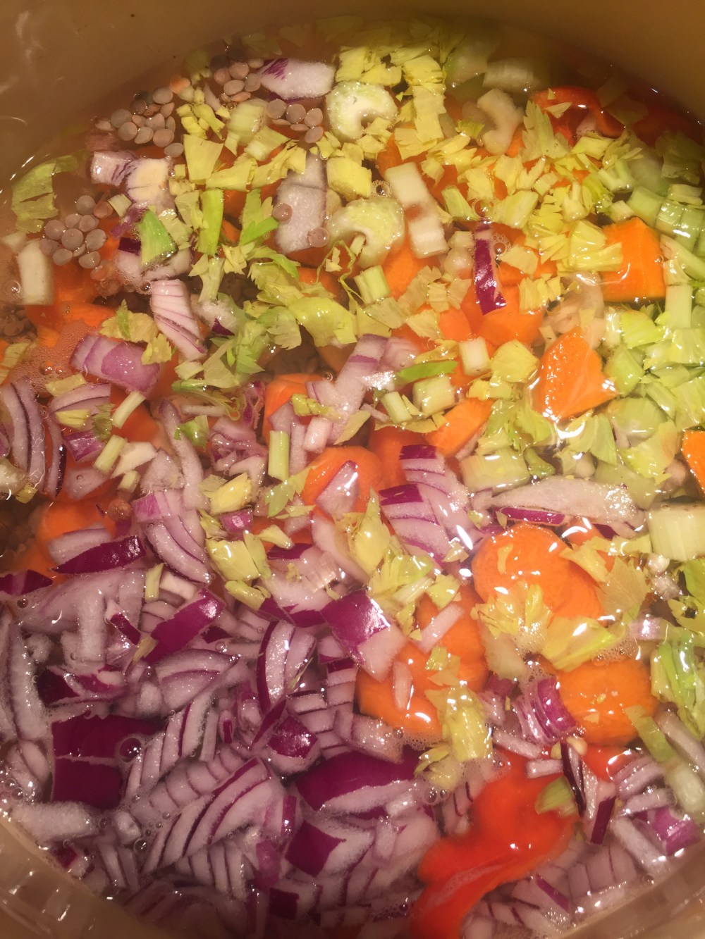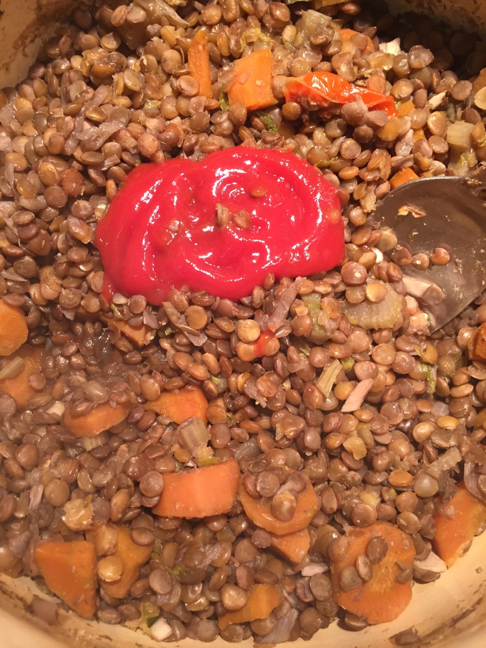 Ugotuj soczewicę razem z posiekanymi warzywami, cebulą i czosnkiem. Dodaj ketchup i sól do smaku.
