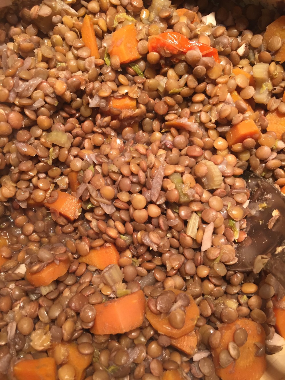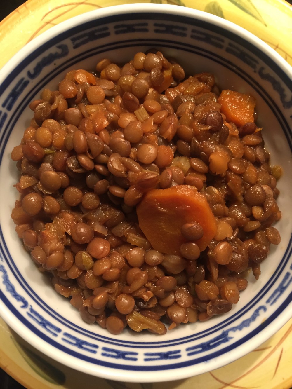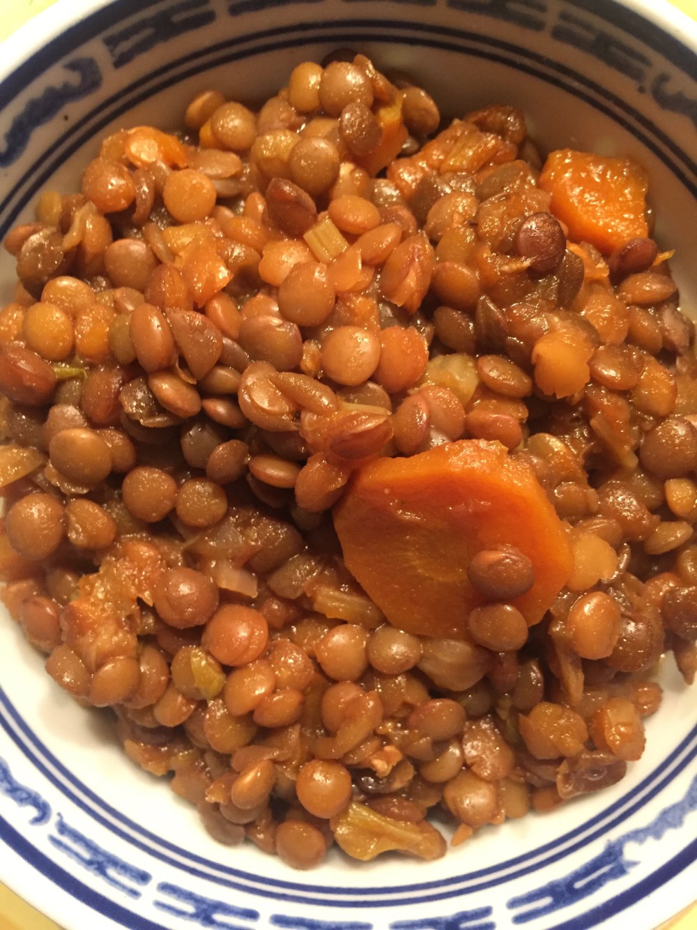 Ten przepis jest gotowany w stylu bardzo popularnego na Karaibach Stew czyli gotowaniu na bazie karmelizowanego brązowego cukru. Najlepiej do tego nadaje się brązowa soczewica (która jest niełuskaną wersją pomarańczowej soczewicy).