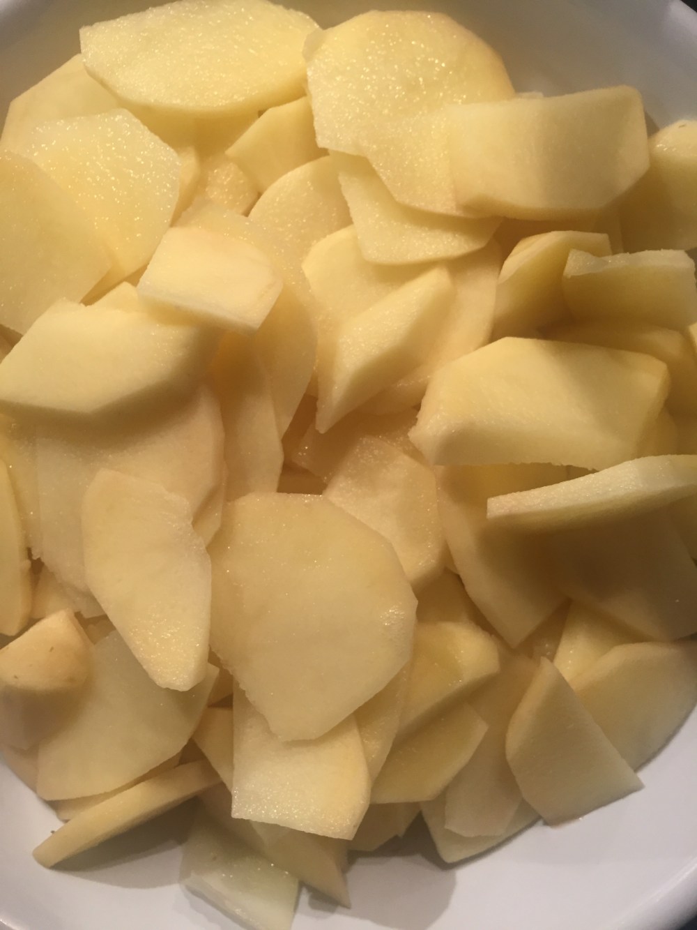 Ziemniaki kroimy na cienkie talarki i półtalarki, kształt nie ma znaczenia, byleby kawałki na były za duże czy za grube. Dodajemy do cebuli. Dodajemy soli i dla miłośników ostrego, papryczkę scotch bonnet. Moja teściowa mawia że jedzenie bez papryczki nie ma smaku. Jest w tym trochę prawdy. Smażymy przez około 10 minut pod przykryciem na małym ogniu. Uważamy żeby ziemniaki się nie przypaliły.
