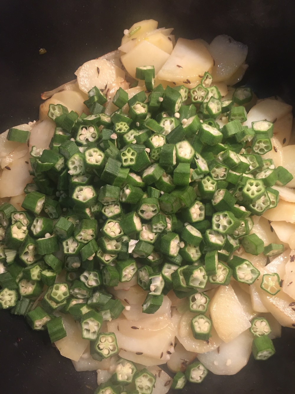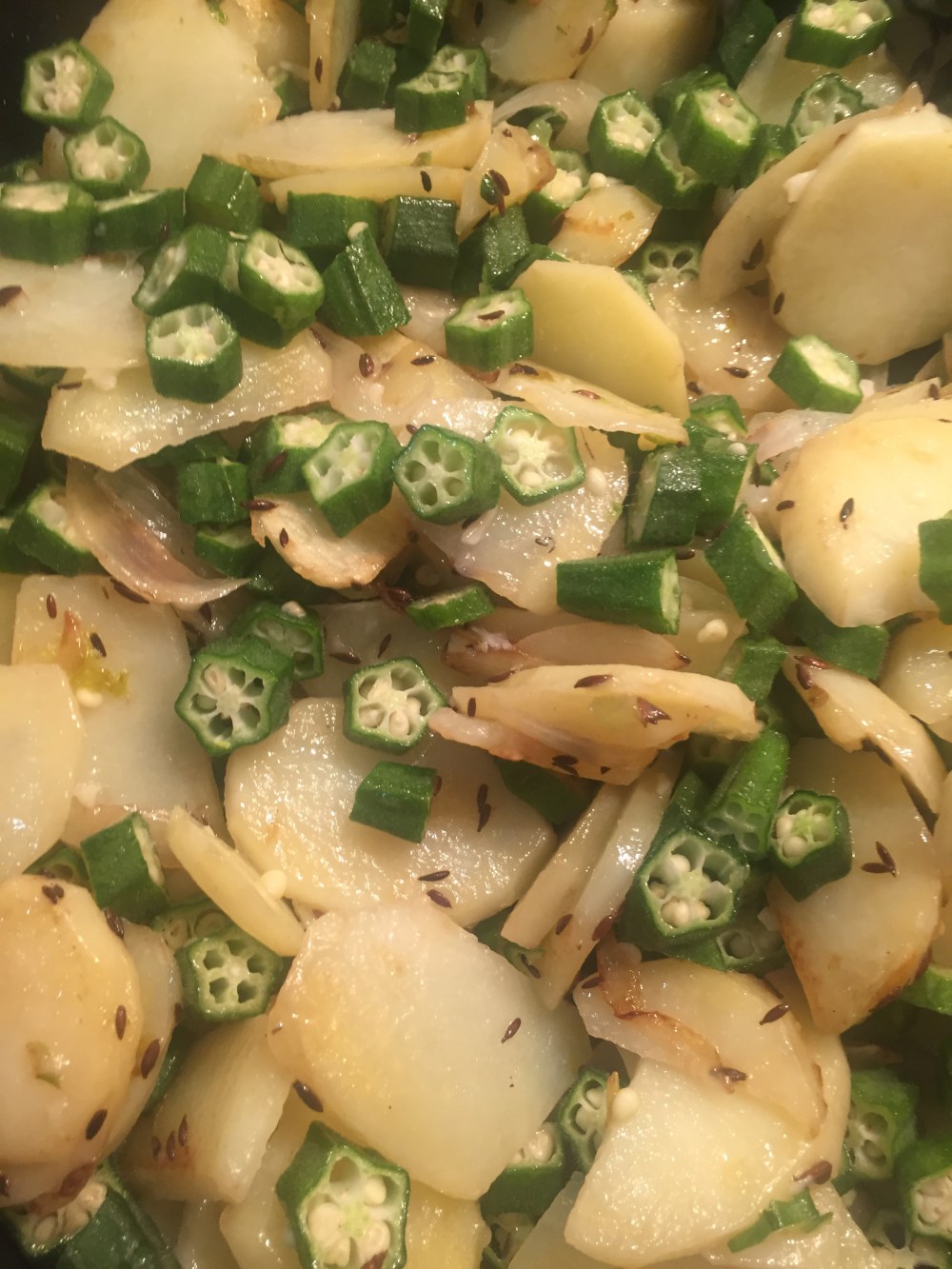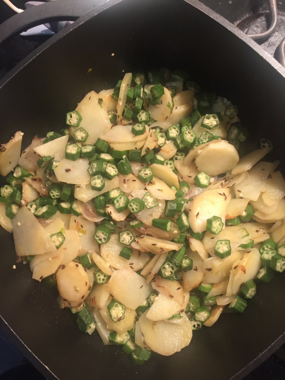 Są dwie szkoły okry i aloo – na sypko i na zlepione. Obie wersje są pyszne, zależy tez to od ziemniaków. Ja gotuję na sypko bo lubię zarumienione ziemniaczki, raczej niż uduszone na puree. Pod koniec dodajemy kumin w proszku i mieszamy.
