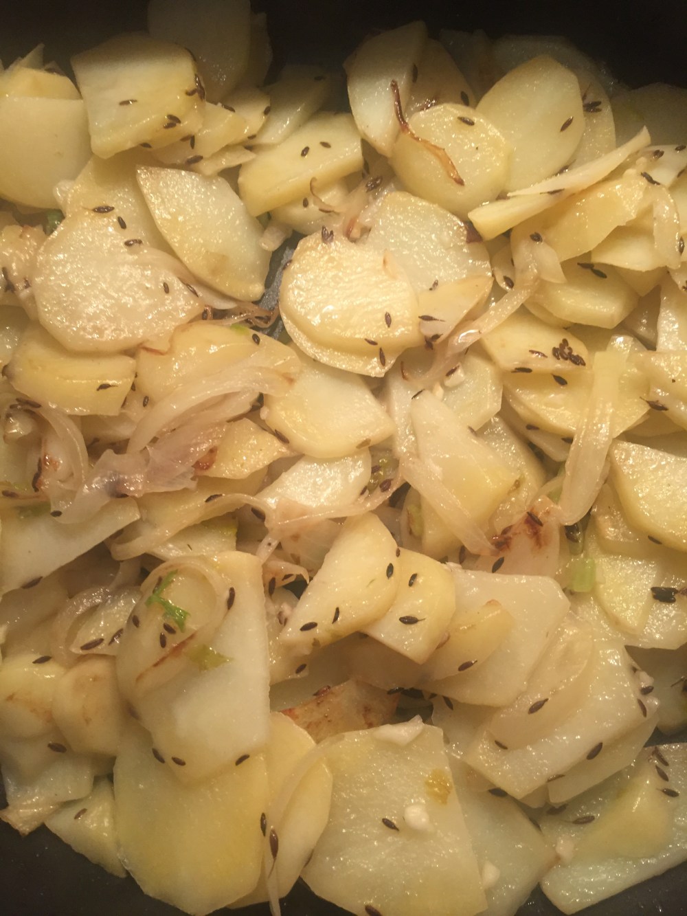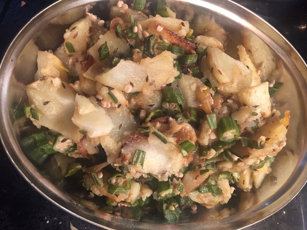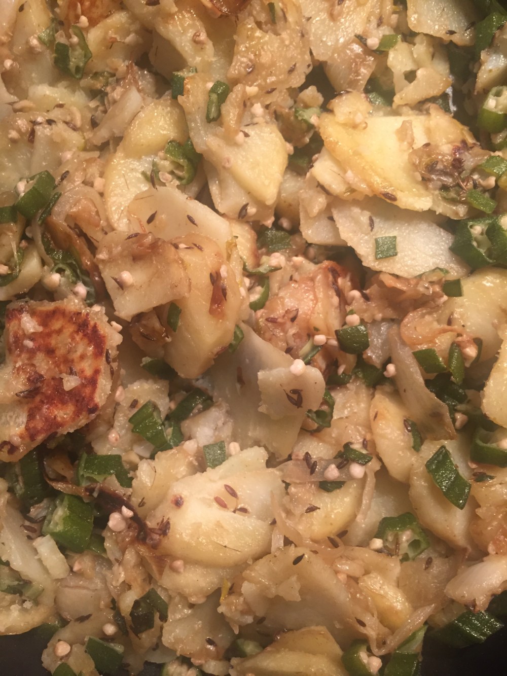 Są dwie szkoły okry i aloo – na sypko i na zlepione. Obie wersje są pyszne, zależy tez to od ziemniaków. Ja gotuję na sypko bo lubię zarumienione ziemniaczki, raczej niż uduszone na puree. Pod koniec dodajemy kumin w proszku i mieszamy.
