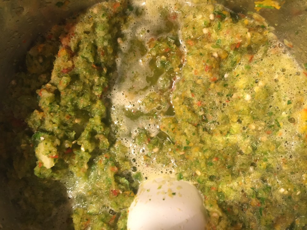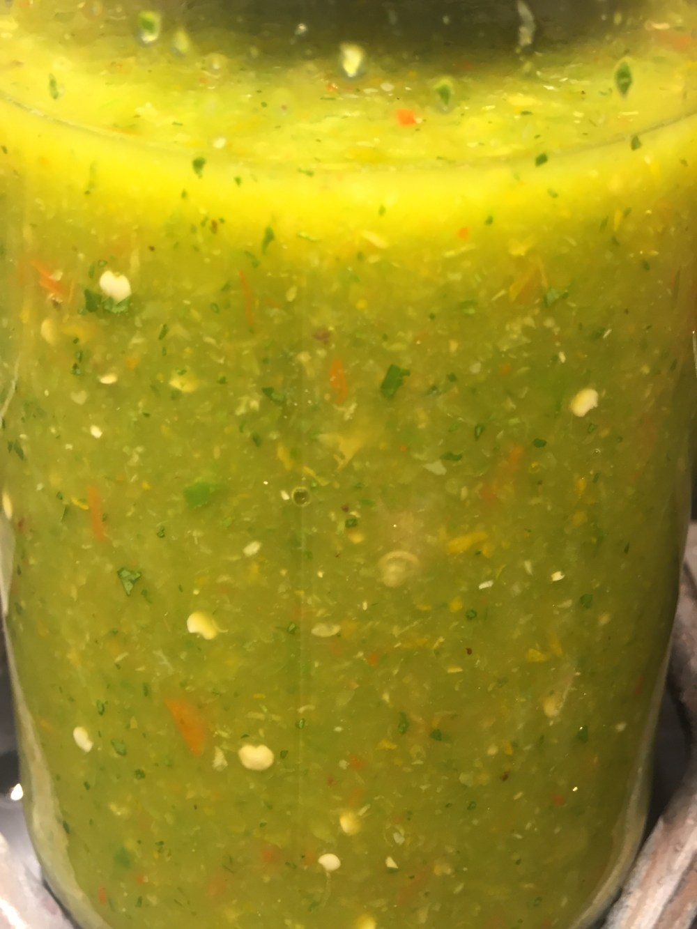 Wszystkie składniki miksujemy w blenderze lub ręcznym blenderem. Ja użyłam białą rzodkiew, która łagodzi ostrość (tak samo jak marchew) i trynidadzki odpowiednik kolendry zwany bandhania.