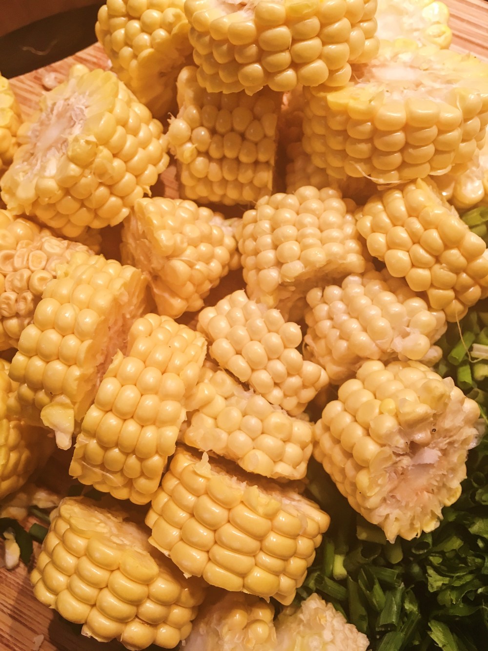 Kukurydze pokrój na kawałki, najłatwiej najpierw ostry koniec noża wbić w kolbę a potem nacisnąć nóż.